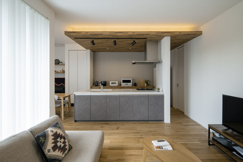 木目天井と間接照明が、キッチンを上質な空間に演出します