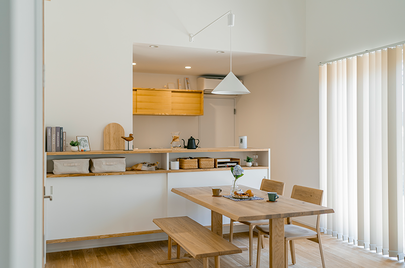 ▲ダイニングの床と同じ「タモ材」を壁に使用