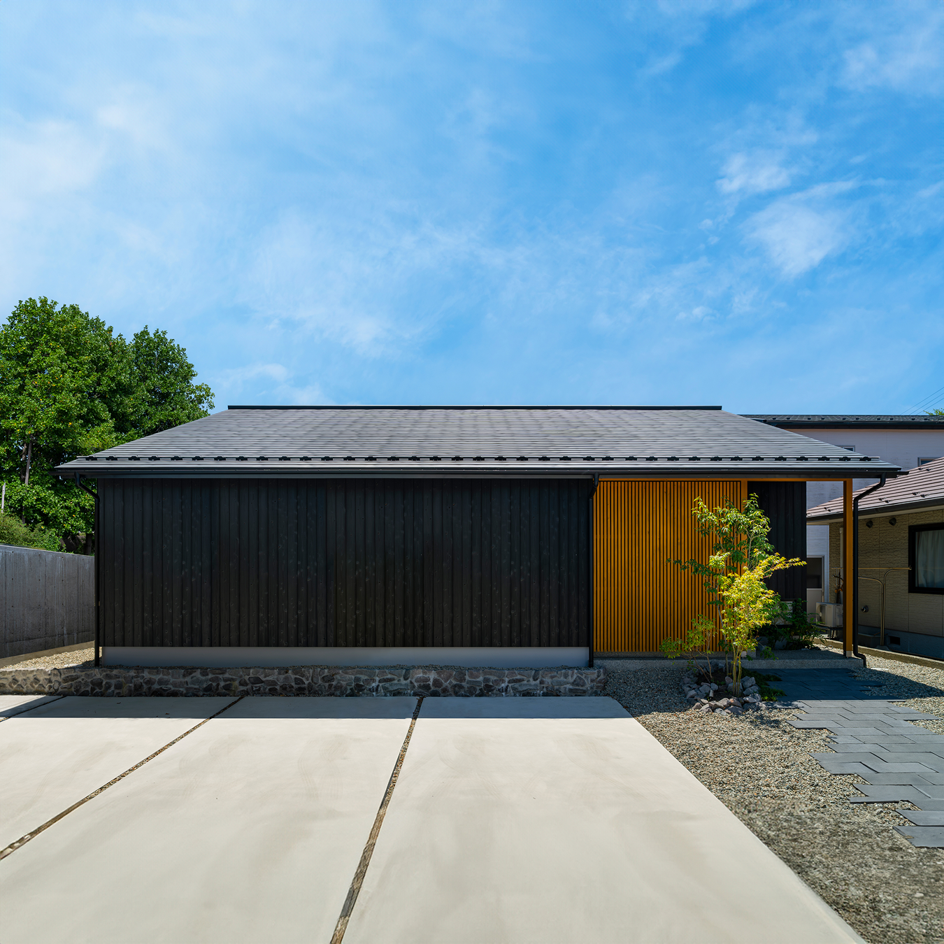 夜はライトアップされた外構に格子が美しい影を描く。