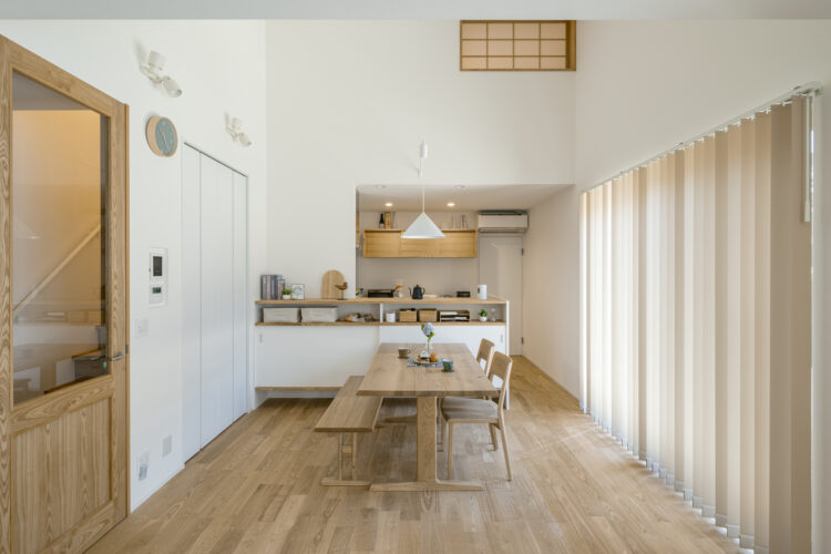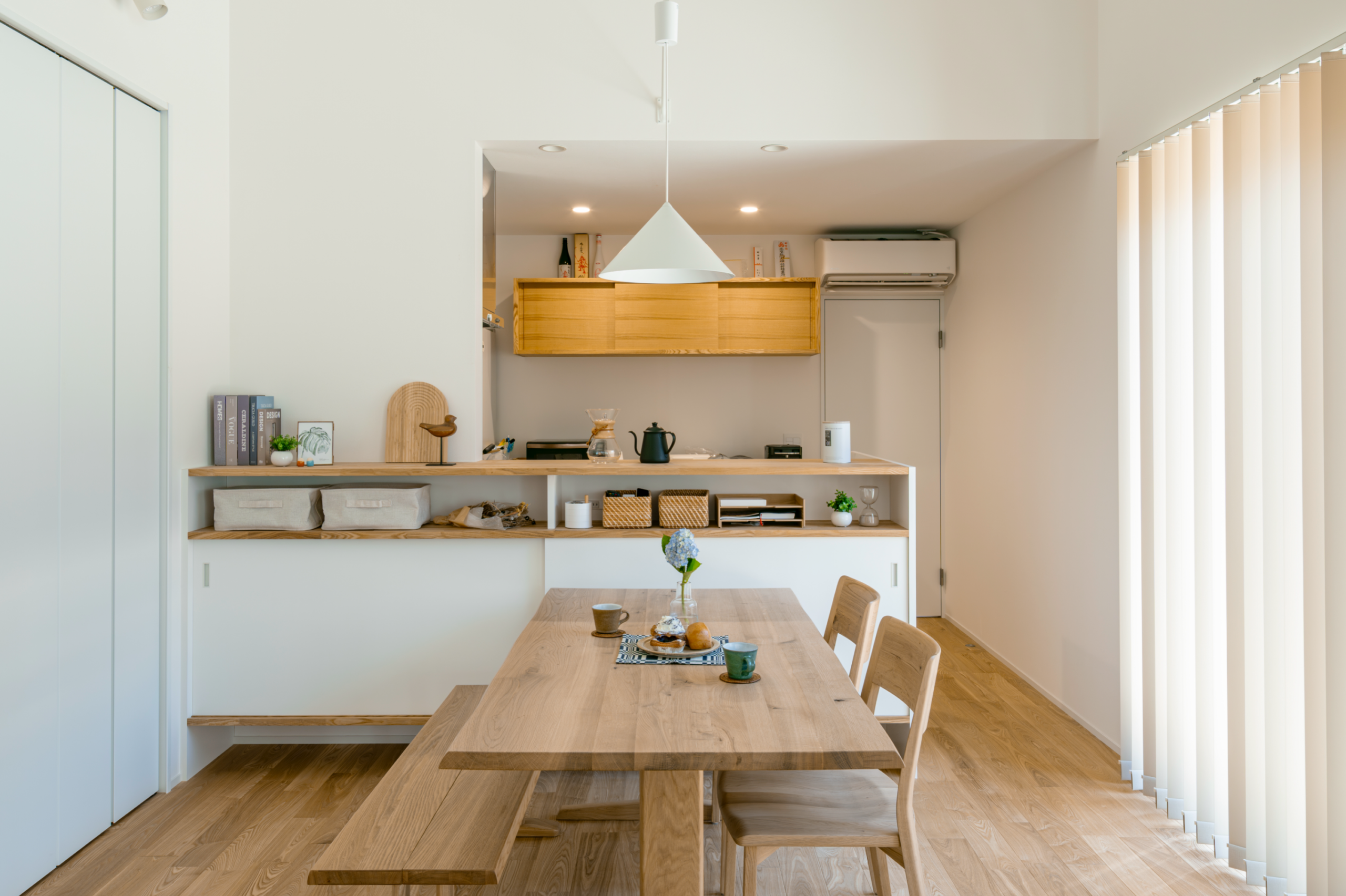 ダイニングのペンダントライトには、設計士さんの並々ならぬこだわりが詰まっています。天井から吊るすと配線が視覚的な「ノイズ」になるからと、壁からパイプを伸ばして設置しました。既製品にはない取り付け方で、私たちのために一から作ってくれた造作です。 子どもを寝かしつけた後、この灯りだけで静かに過ごすのが夫婦の楽しみ。吹き抜けの中に、光がひとつポツンと浮かんでいるような落ち着いた空間です。