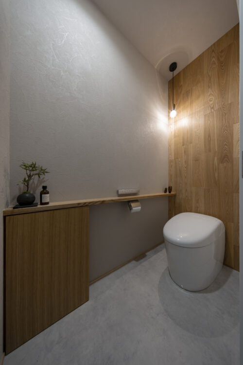 当初はオークの床材を考えていたのですが、設計士さんが提案してくれたのは「タモ材」でした。初めて聞く名前でしたが、木目が美しく、丈夫でコストパフォーマンスにも優れていると聞き、採用。その風合いをすっかり気に入り、トイレの壁にも使いました。自分たちの知識だけでは辿り着けなかった答えをくれる、設計士さんって「さすがだな」と思いました。