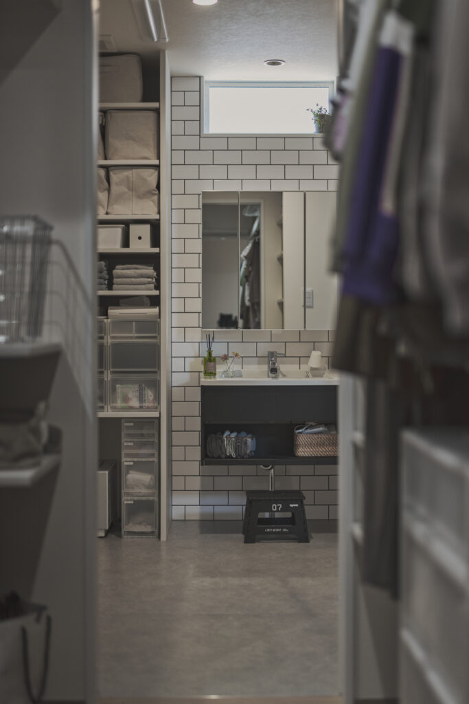 ▲家事ラクを叶える回遊動線と、たっぷり収納がひと続きになった洗面スペース。