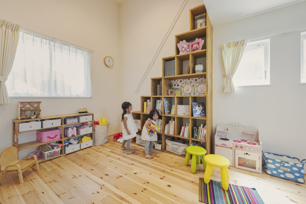 - 本棚階段とロフトが楽しい、子どもがのびのび過ごせる空間
