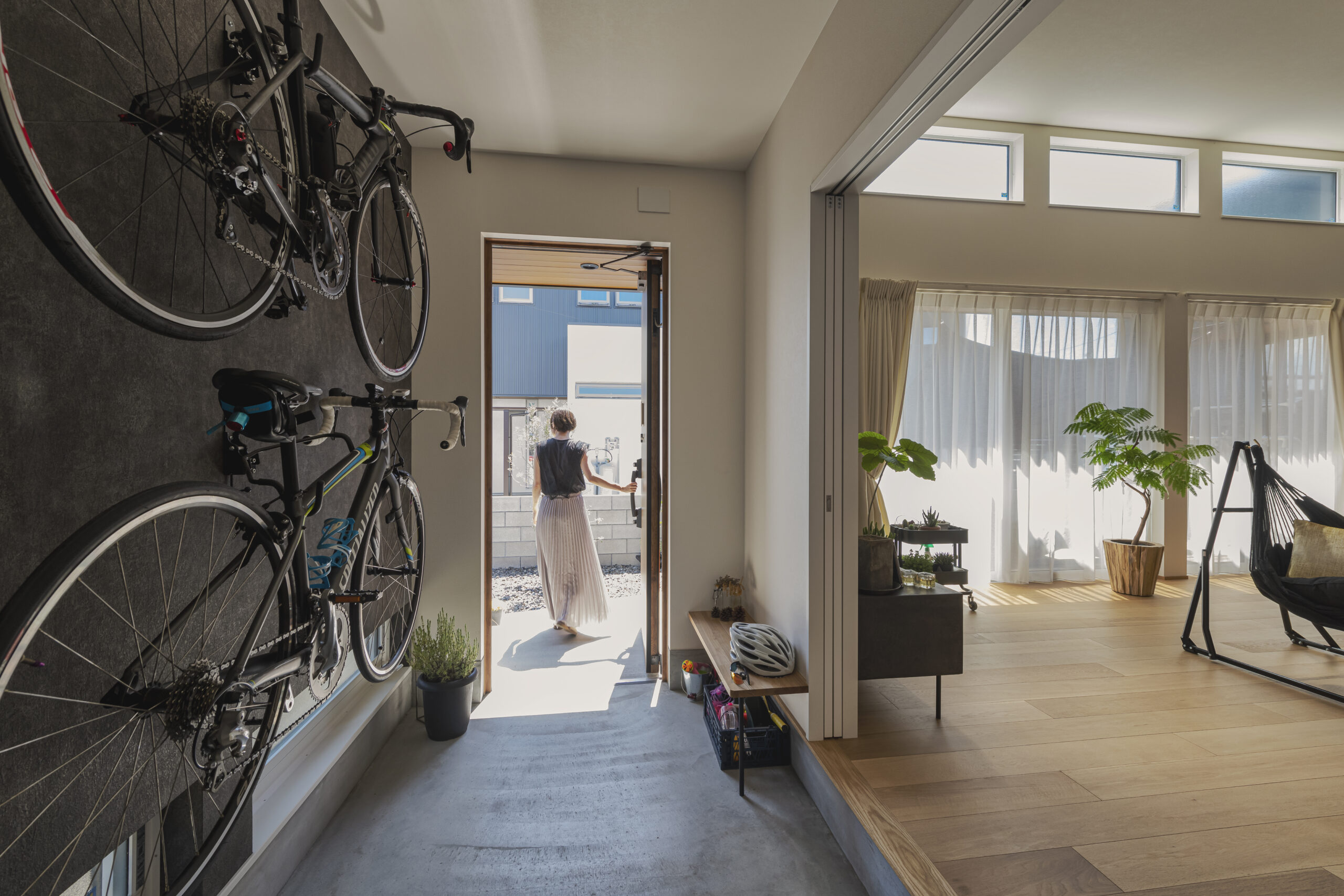 ▲玄関ホールをなくすことで、土間から続く空間がより広く感じられます。