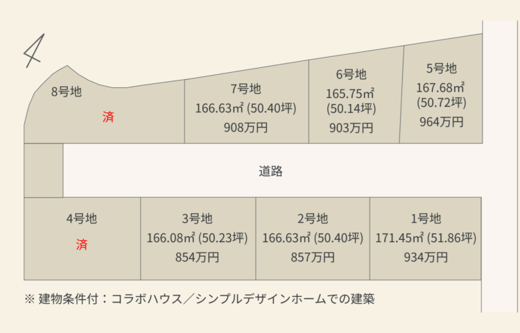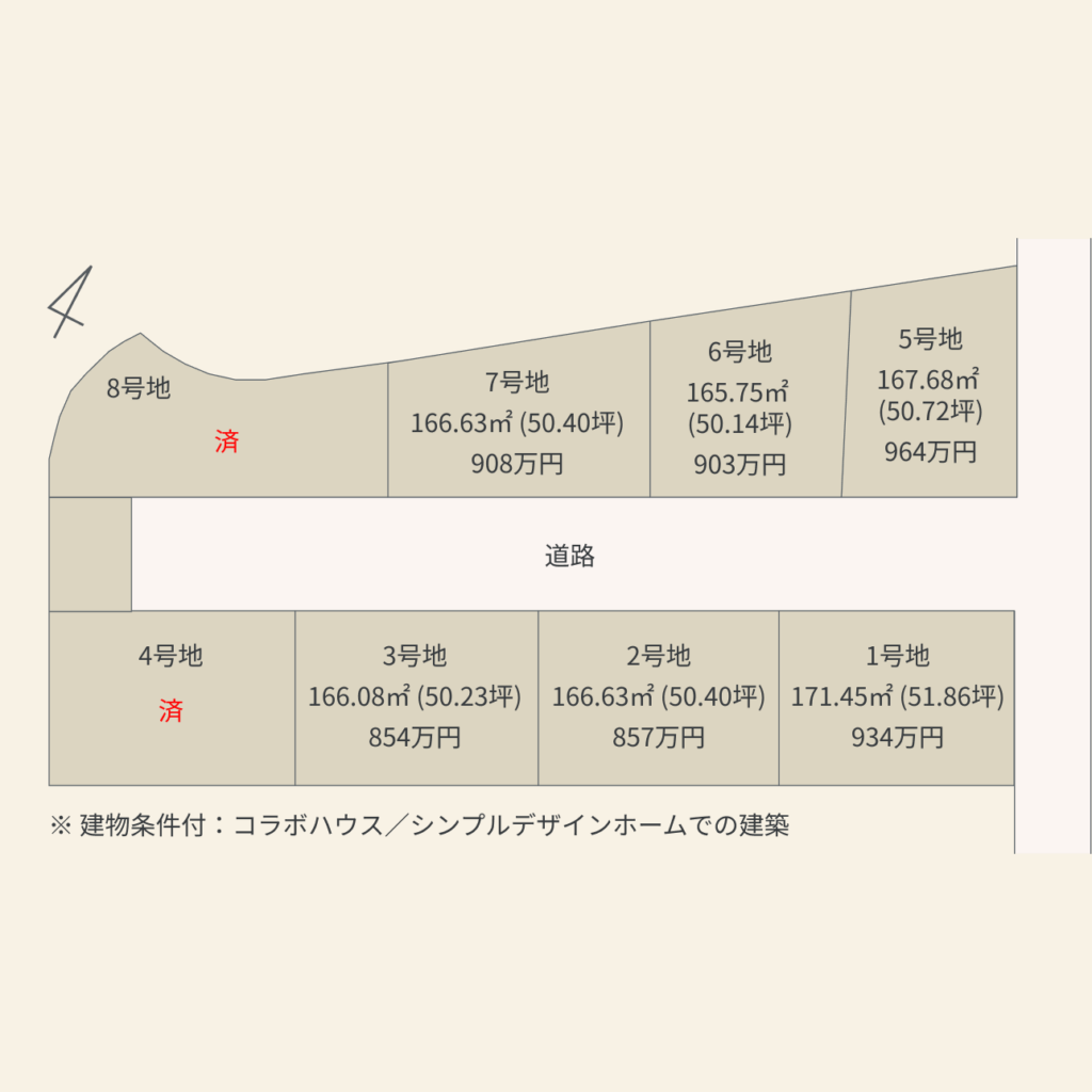 本土地は、土地売買契約後3ヶ月以内に当社(コラボハウスまたはシンプルデザインホーム)との間で建築請負契約を締結することを条件として販売します。この期間内に建築請負契約が成立しない場合は、土地売買契約は白紙となり、受領した金銭は名目のいかんを問わず全額遅滞なく返還いたします。 |