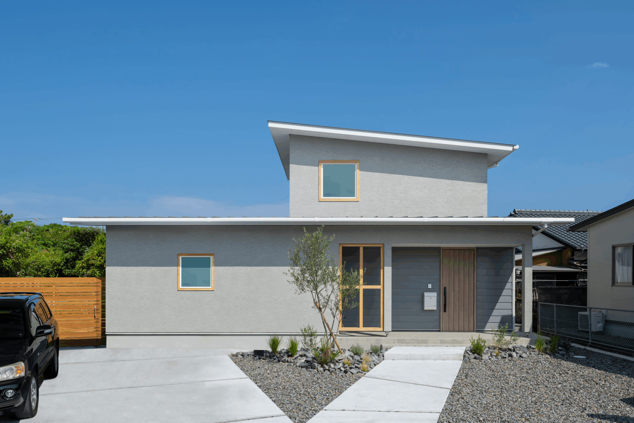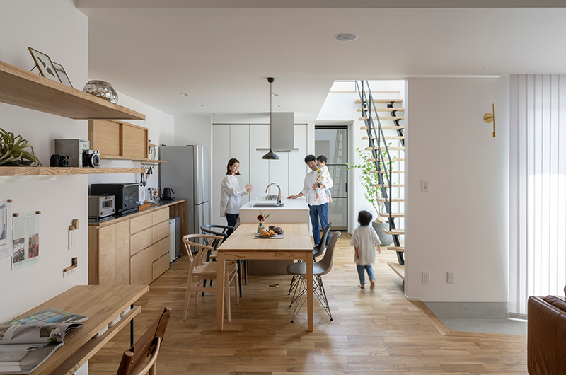 約132坪の広々とした敷地に建つコの字型の住まい。中央のタイルデッキを囲むように配置し、どこにいても自然の光と風を感じられる間取りになっている。勾配天井のリビングは土間とつなげて、屋外との一体感を高めた。土間の先にはアウトドア道具をしまえる“秘密基地”のような収納スペースがあり、リビングとの間に小さなトンネルを設けて遊び心を添えている。ダイニングの中心には、空間を彩るアイランドキッチンとスケルトン階段を配置。背面には水回りをまとめ、玄関へと回遊できる動線で家事効率も高い。広い敷地を活かしながら、開放感と機能性を両立させた住まいになった。