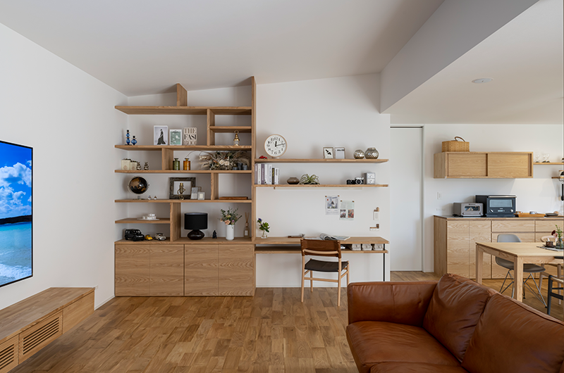 ▲壁面収納を兼ねた造作棚で、空間をすっきりと美しく