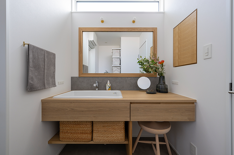 ▲収納まで計画された造作洗面で、すっきりとした朝時間に