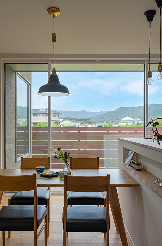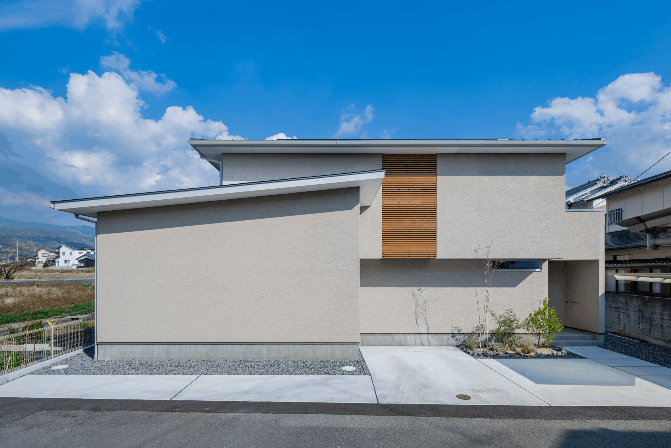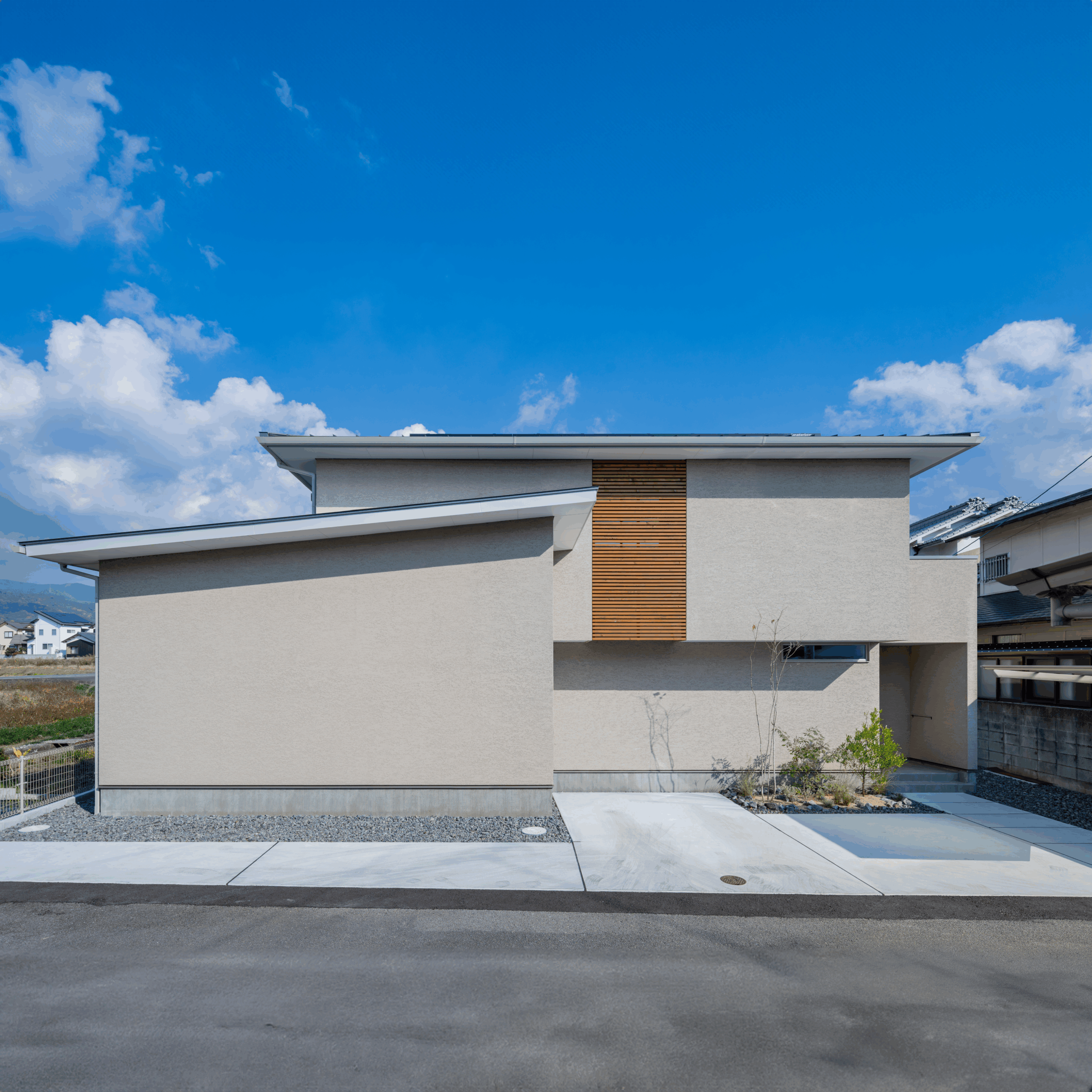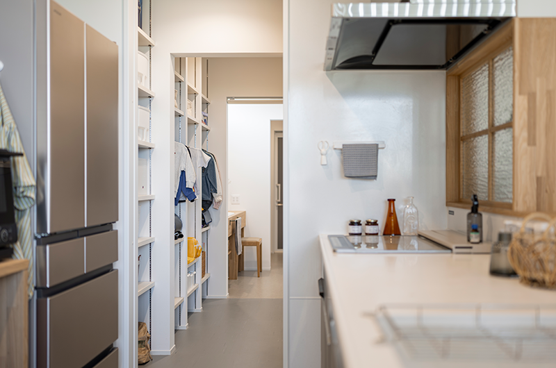 周囲に家が少なく、田畑が広がるのどかな敷地は車2台駐車してもかなり余裕のある広さ。カーポートを設置して、駐輪スペースとして活用できる。お庭は日がたくさん入る南側ではなく、あえて北側に。家の中から山が見えて目の前に田んぼが広がる一番いい景色が望める。キッチンからパントリー、ウォークスルークローゼット、洗面所、脱衣所へと一直線で行ける間取りのおかげで家事動線が最小限に。逆に通ると帰宅してから手を洗い、荷物を置き、キッチンへ抜けるという帰宅動線もばっちり。クローゼットには、3人のお子様が学校から帰ってきたときに制服やランドセルを置ける専用の収納棚も。自然と片付け習慣が身に付くのが嬉しい。