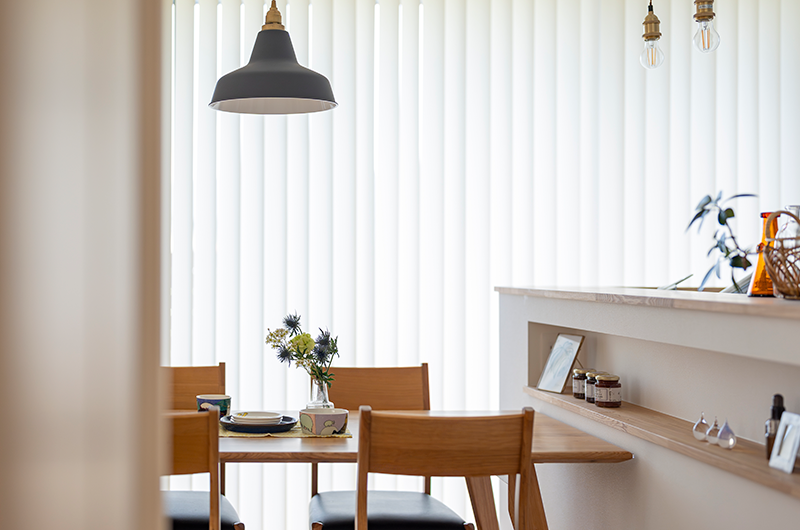 ダイニングテーブルの高さに合わせて壁を掘りこんだニッチには時計や卓上カレンダーなど小物を飾って。