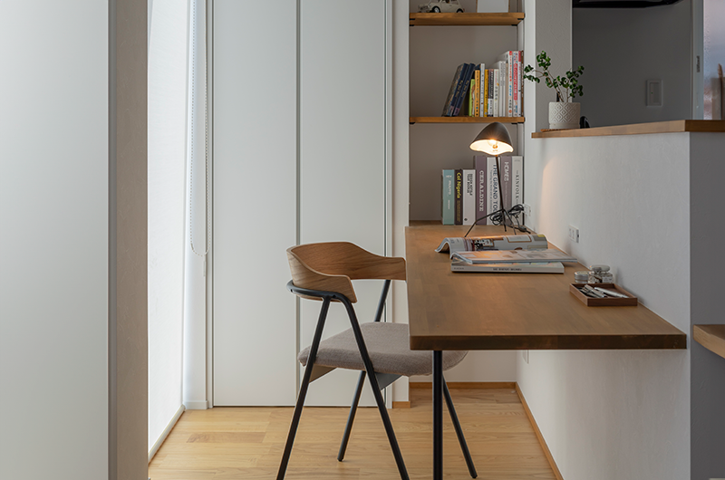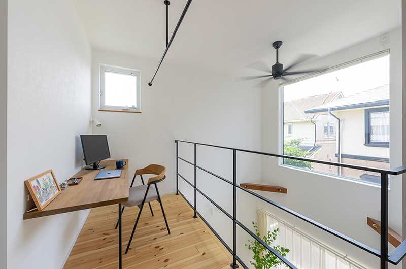 2階には吹き抜けと隣り合うワークスペースを設け、暮らしの中に自然と集中できる場所をつくった。