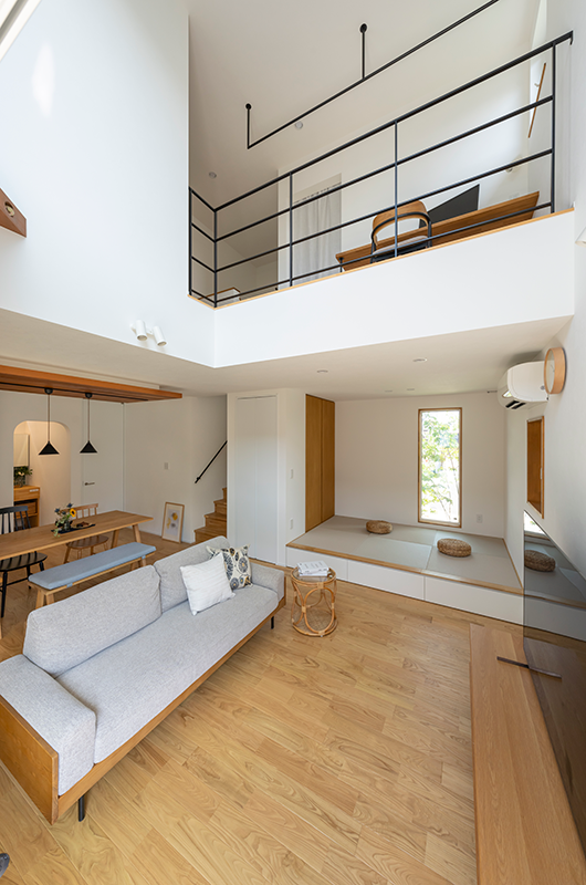 小上がり和室やダイニング、リビングがやわらかにつながり、家族それぞれの場所を持ちながらも気配がふわりと届く、安心感のある間取り。
