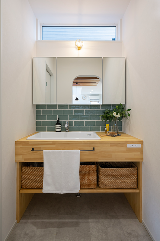 ▲ グリーンタイルがアクセントになった、朝の支度が心地よく進む造作洗面