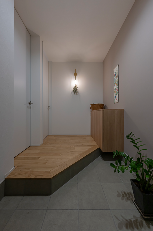 ▲やわらかな灯りと木の収納が迎える、静かな玄関ホール