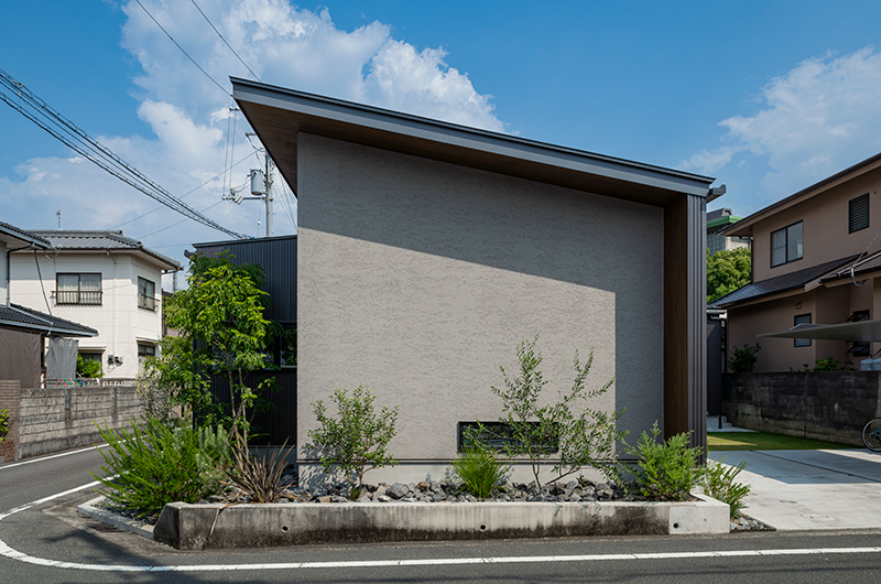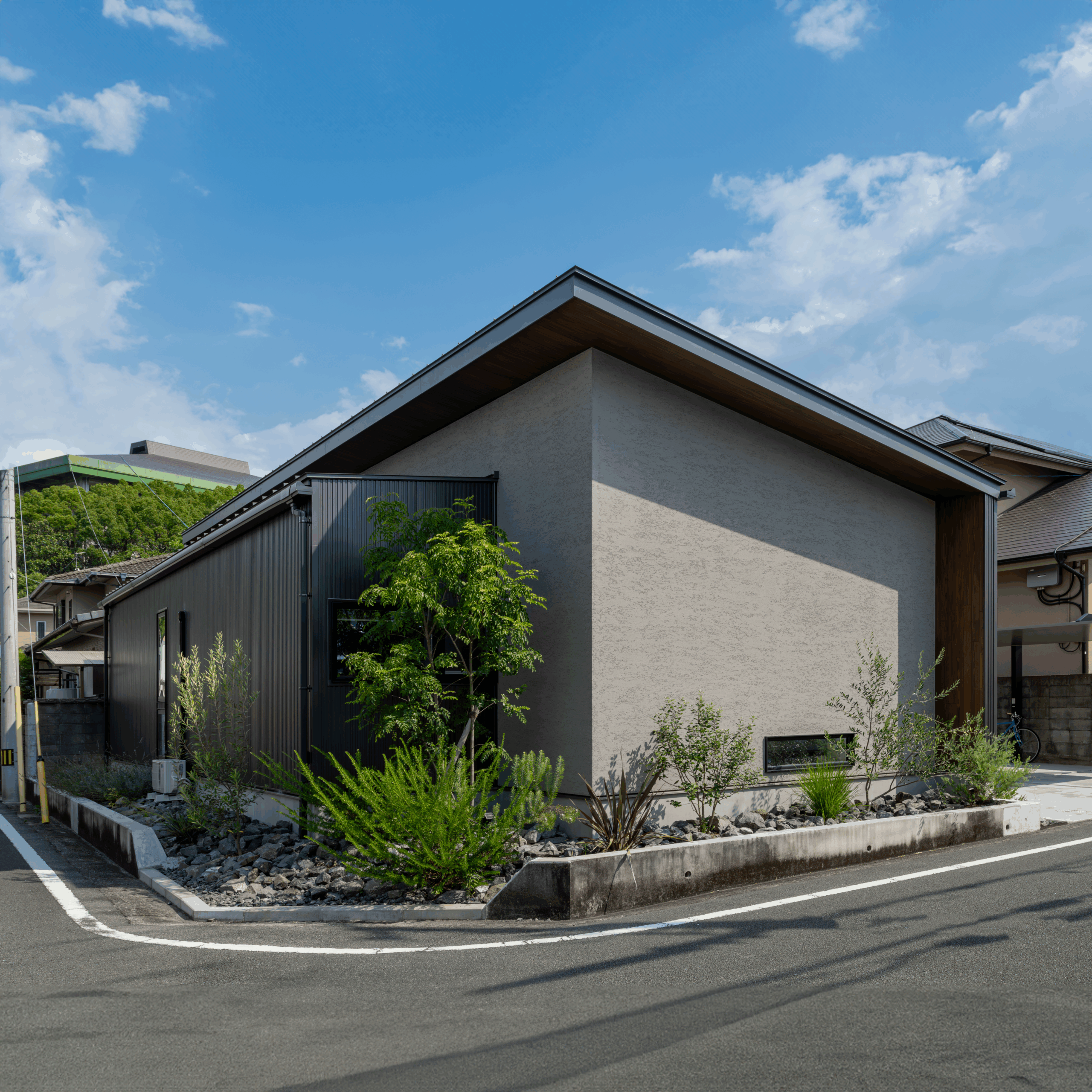2方向に道路がある敷地に建った片流れ屋根の平屋。どちらから見てもカッコイイ外観になるような形にこだわった。黒のガルバリウム外壁とグレーの塗り壁で更にスタイリッシュな雰囲気に。邸内は、がらりと変えて白を基調にしたナチュラルなインテリア。20.5帖のリビングダイニングは勾配天井で広がりを演出している。お風呂や脱衣所、ランドリースペースといった水回りとキッチンをまとめた間取りは家事動線が短く、移動がスムーズ。ランドリースペース横にクローゼットを配置し、洗濯から片付けまでほぼ1カ所で済ませられるのが嬉しい。