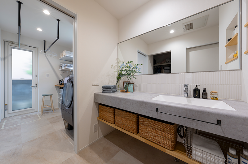 ▲洗面所奥は脱衣室兼ランドリースペース。室内干しもできる。