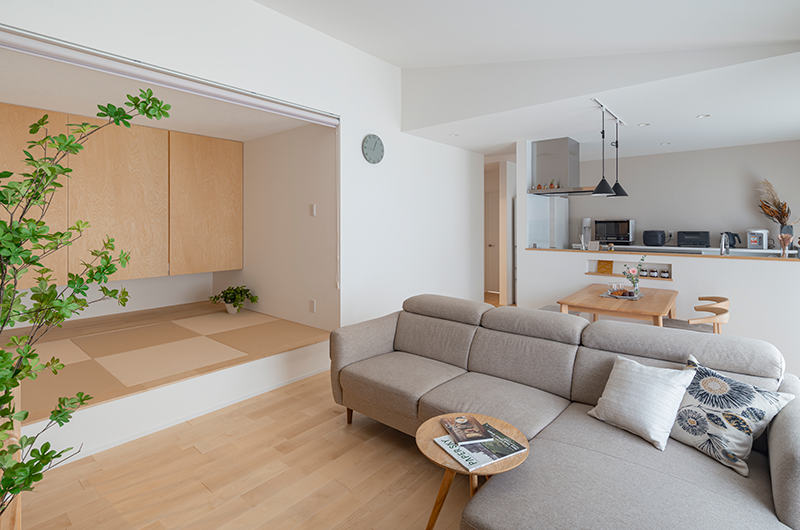 ▲3帖の小上がりは両親が泊まる寝室として、子どもの昼寝場所として大活躍。ロールカーテンで区切れば、目隠しも。