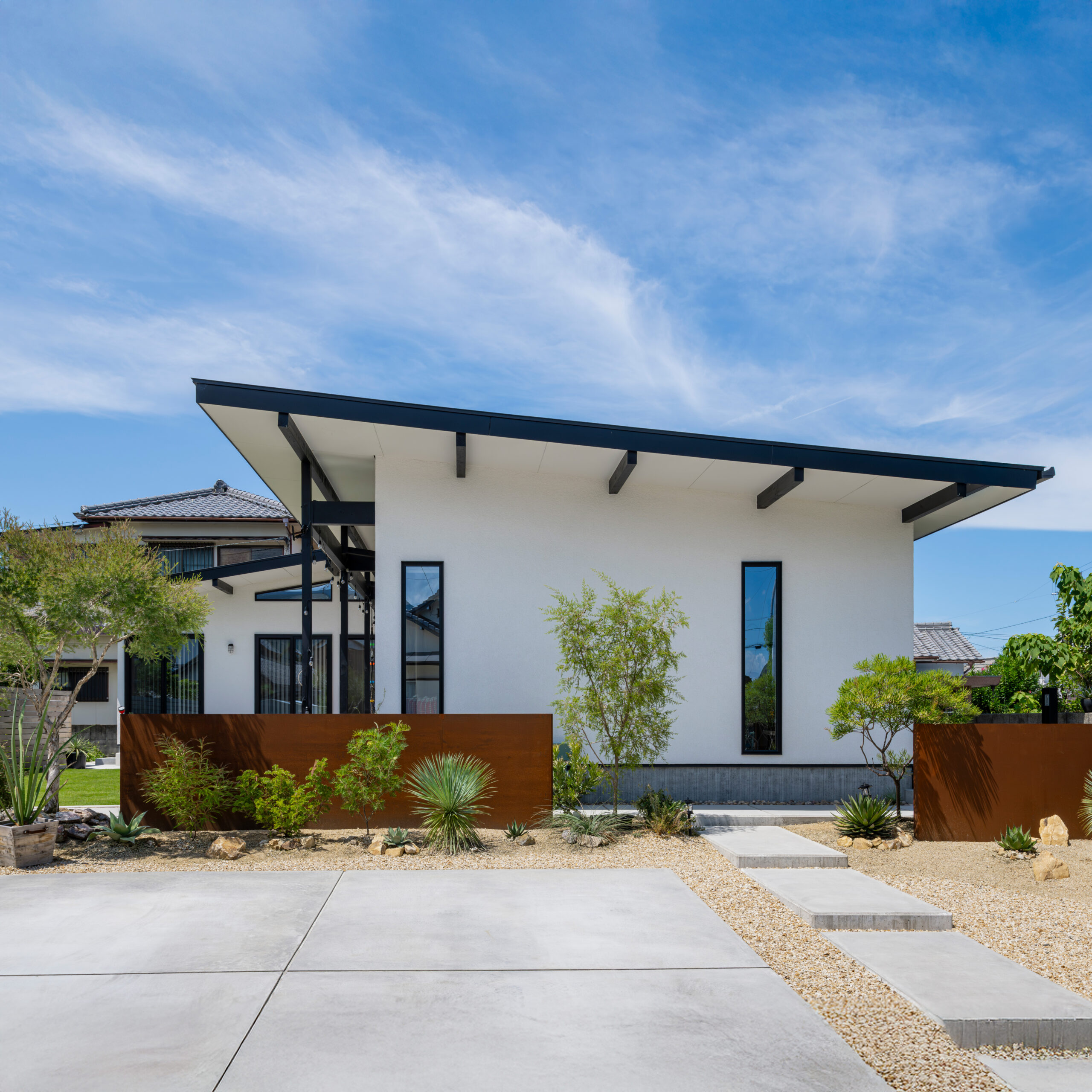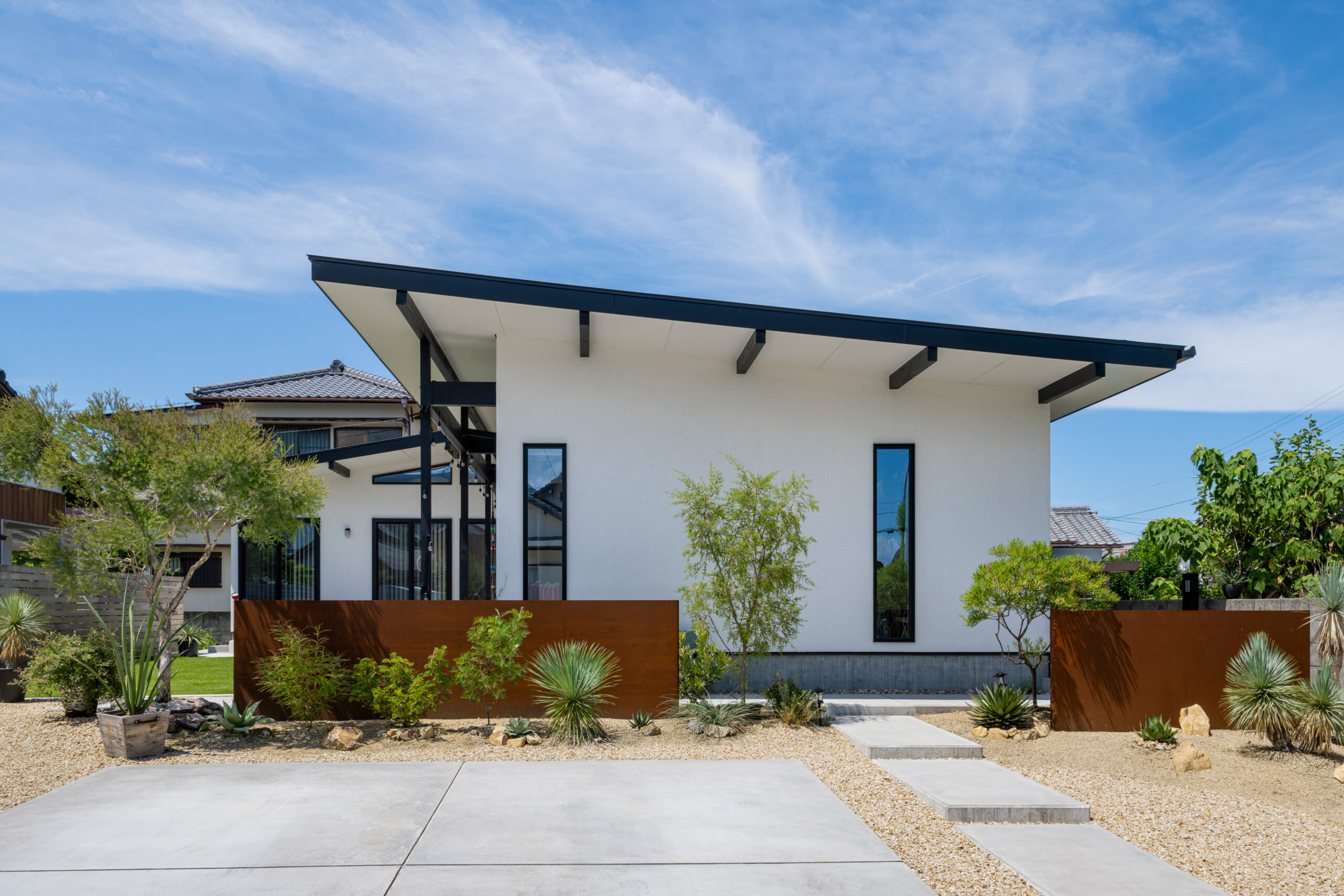 植物を愛するご夫婦が叶えたのは、鉄壁と白壁に珍しい植栽が映える平屋の住まい。 室内はミッドセンチュリーの家具で統一され、石張りの壁がモダンなモビールやランプを引き立てる上質な空間。 こだわりは、ダイニングからもリビングからも庭が見える大きな窓。日差しを遮るタープを設置した庭や、リビングと一体化した広いウッドデッキは、お子様の絶好の遊び場に。