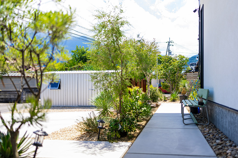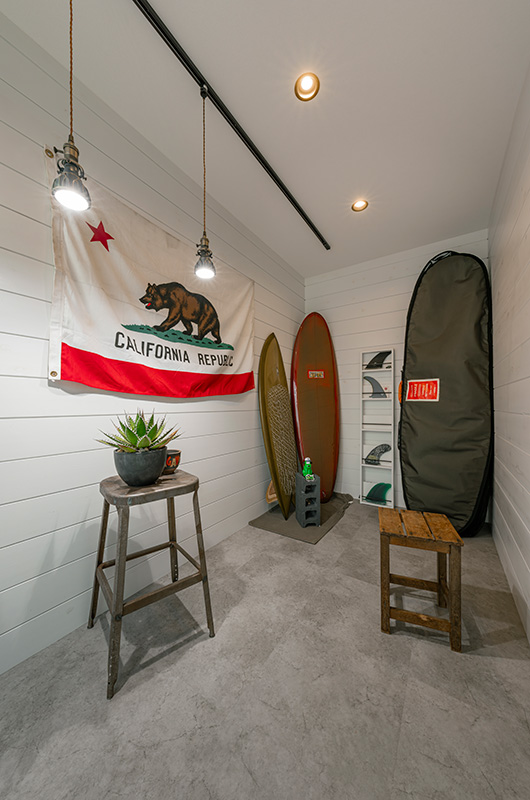 ▲庭から出入りできるサーフボードのお手入れにも使える趣味部屋