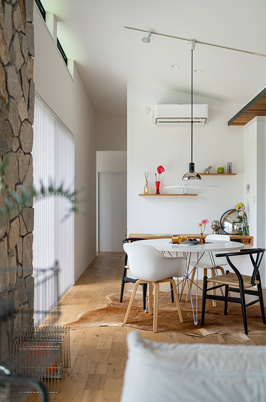 ひとつながりの大きなリビングダイニングを石壁と天井の梁がゾーンをゆるやかに分ける。勾配天井ならではの開放感も
