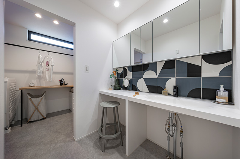 ▲個性的なタイルが素敵な造作洗面台。奥は脱衣室兼洗濯室