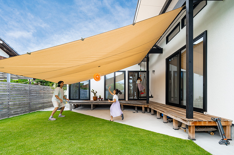 ▲広い芝生は寝っ転がって遊ぶのも気持ちいい。夏はタープで日差しを遮り、冬は温かな陽光を取り入れて快適な暮らしを