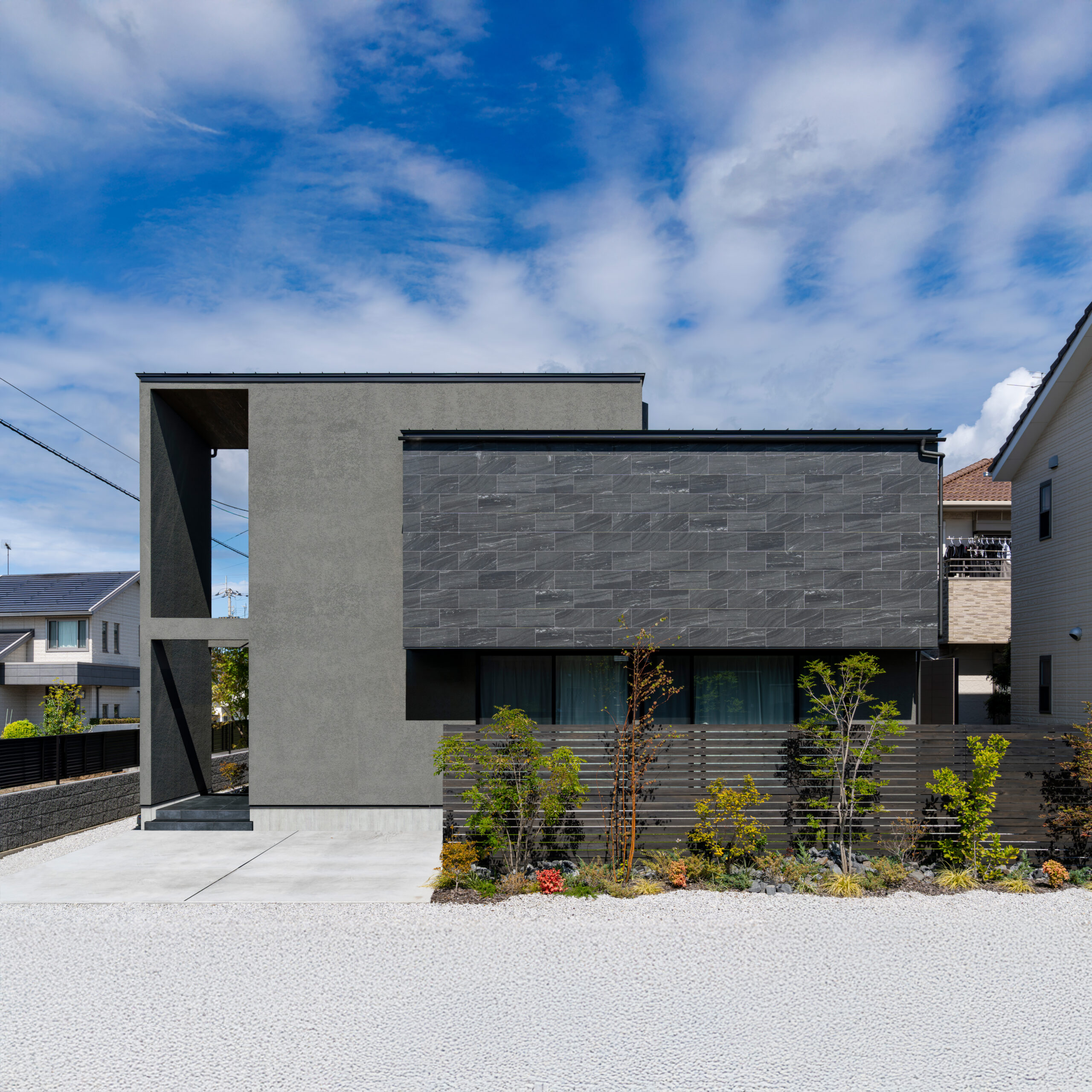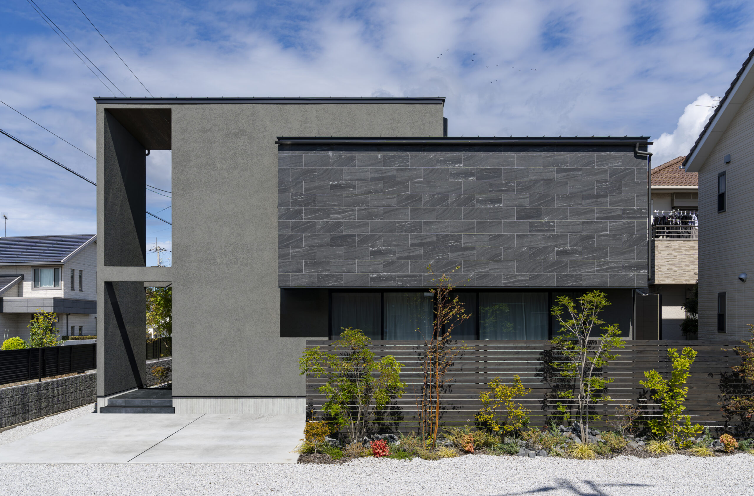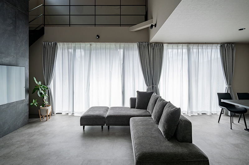 ▲南面に並んだ2つの大きな窓が柔らかな光と陽気を運んでくれる。素材や質感が異なるグレーの組み合わせが洗練された印象に