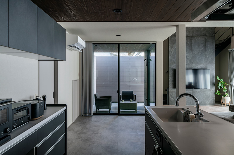 ▲キッチンもダイニングテーブルセットも黒で統一し、すっきりと。色味を抑えたことで天井の間接照明や壁のニッチが映える