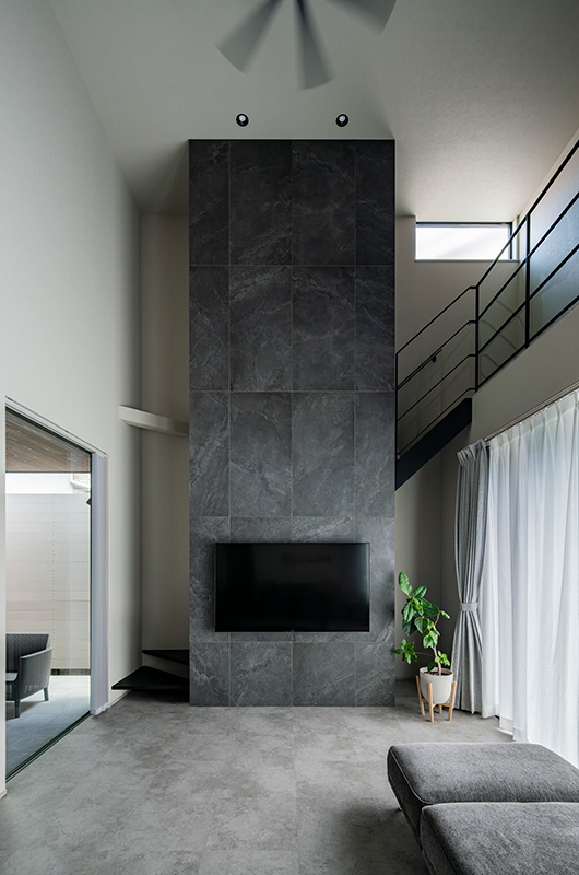 一番の見どころは、リビングの吹き抜けを天井まで突き抜ける高さ約6mの石壁。