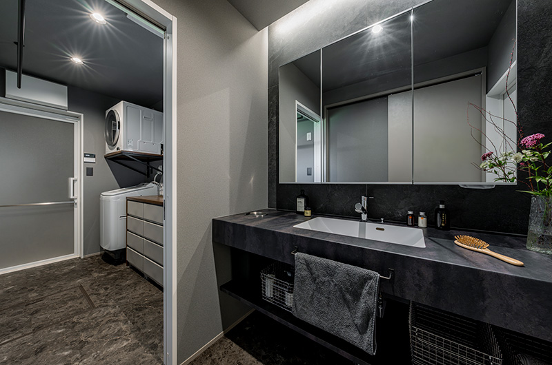▲海外ホテルのようなスタイリッシュな造作洗面台