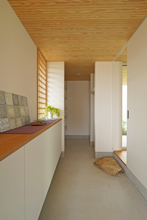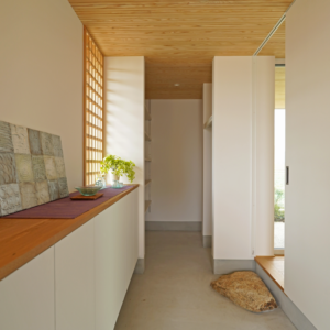 - 木の格子とこだわりの靴脱石が創る趣ある玄関