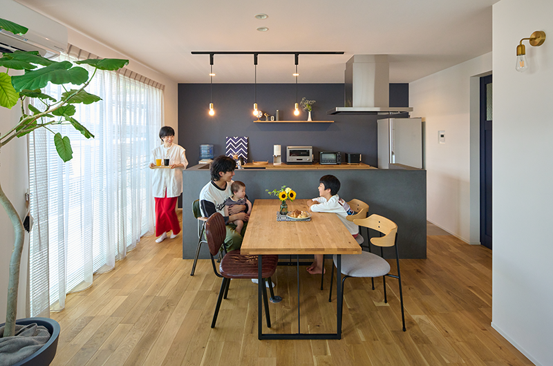 LDKは家族が集まる場所として、ダイニングとキッチンをゆったり配置。食事をしながら会話が生まれ、子どもたちが思い思いに過ごす気配も感じられます。