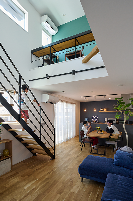 ▲吹き抜けと鉄骨階段で、上下階につながりをもたせたリビング