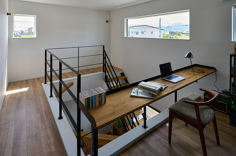 上階には吹き抜けに面したワークスペースを設け、家族のつながりと、ひとりの時間のどちらも大切にできる住まいです。