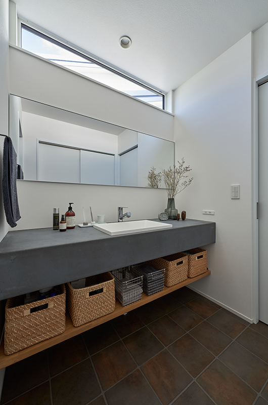 ▲ 横長の窓から光を取り込む、造作洗面スペース