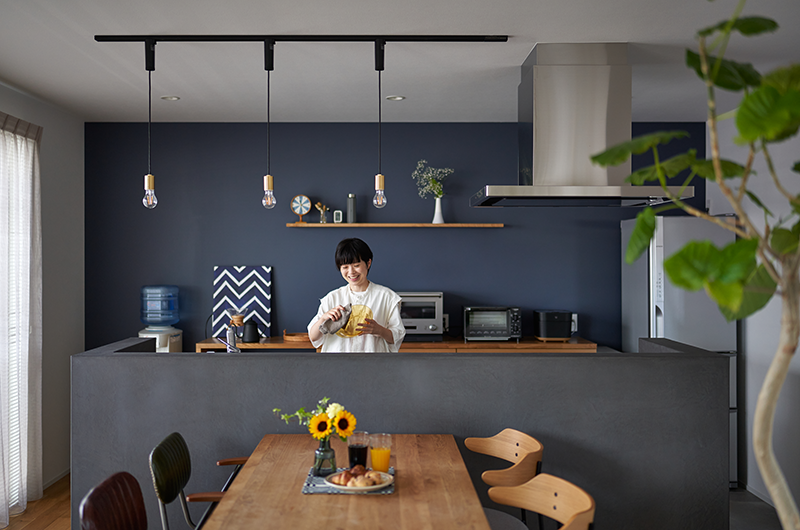 ▲キッチン背面のアクセントクロスが空間を引き締め、回遊しやすいアイランドキッチンを採用