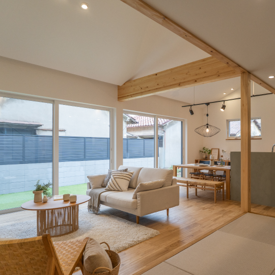 - 庭へとひらく大開口と勾配天井のLDK
