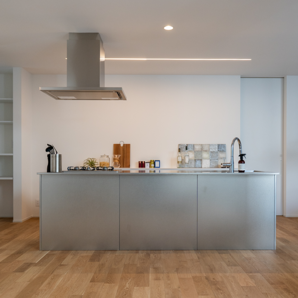 - 空間の中心に据えた、オールステンレスのアイランドキッチン