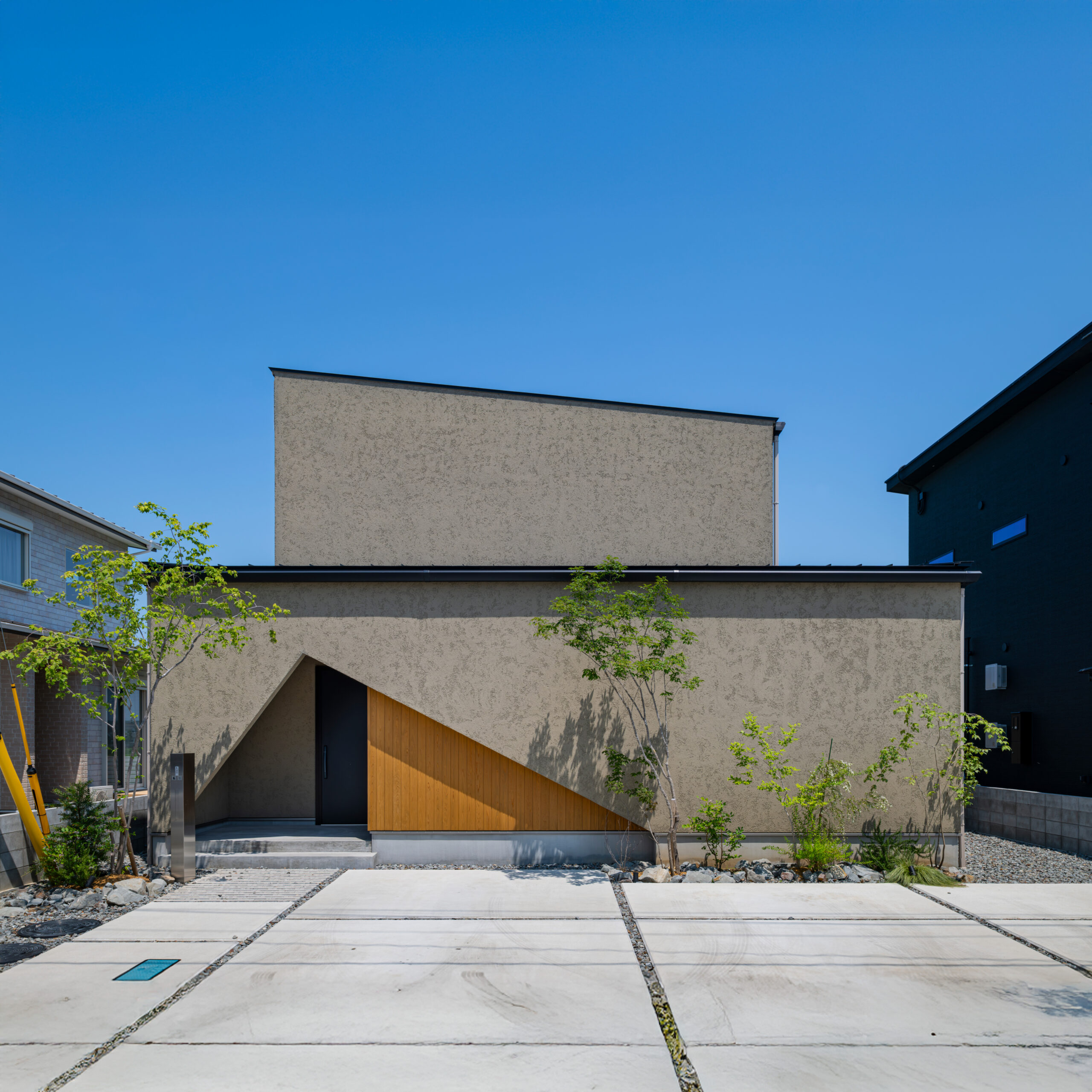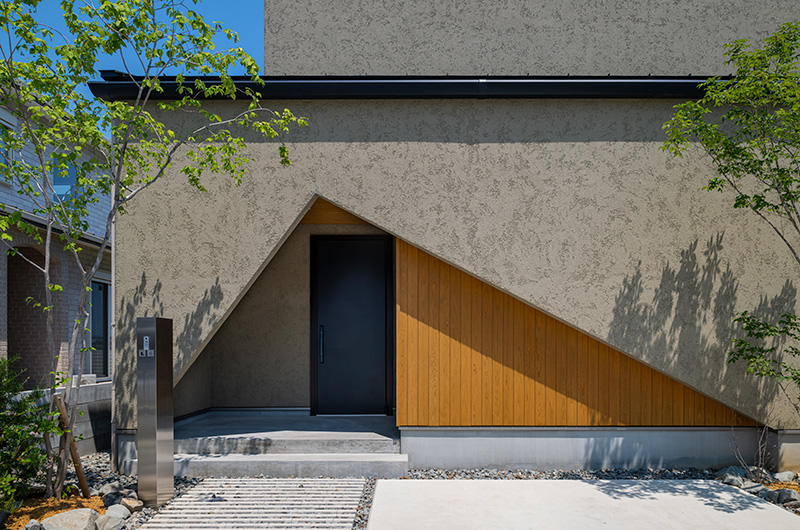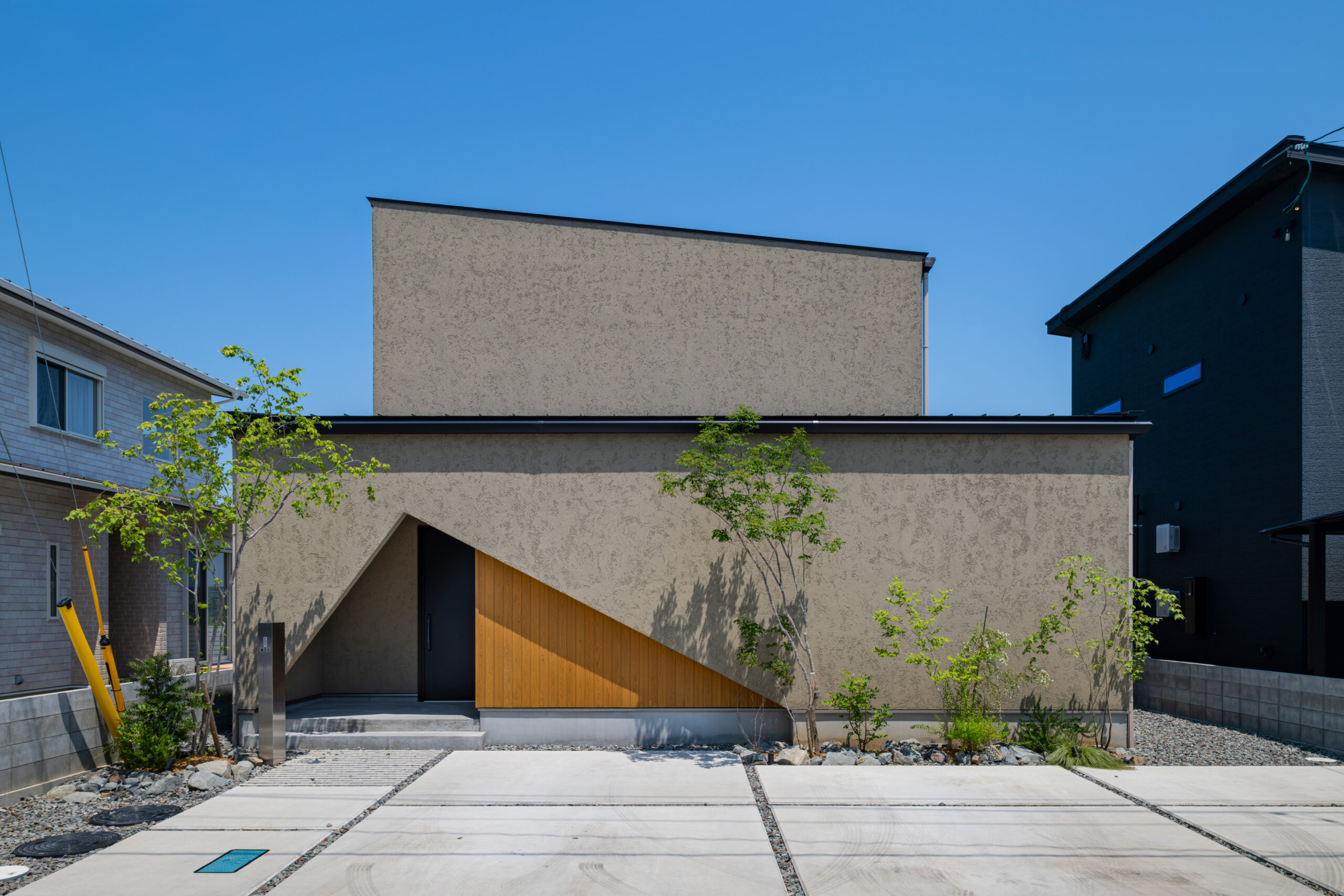 装飾に頼らず、輪郭そのもので個性をつくる佇まいが、この住まいの第一印象となっている。