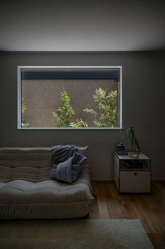 リビングの窓からは中庭の景色を望み、和室には地窓を設けて、視線を気にせず外の気配だけを取り込めるようにした。