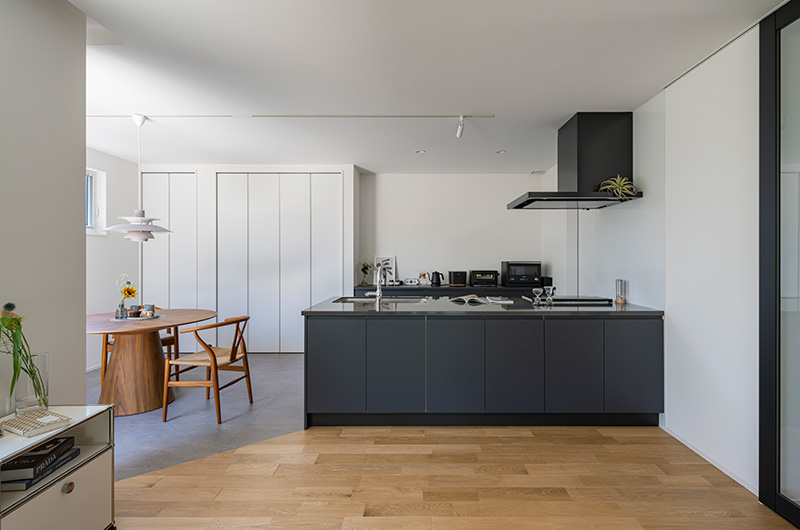 LDKでは、ダイニングとリビングで床材をはっきりと切り替え、同じ空間の中に過ごし方の違いをつくっている。