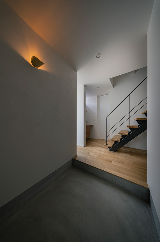 洗面所では高窓から空が切り取られ、玄関では真鍮のアッパーライトが優しく壁を照らす。