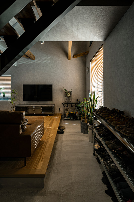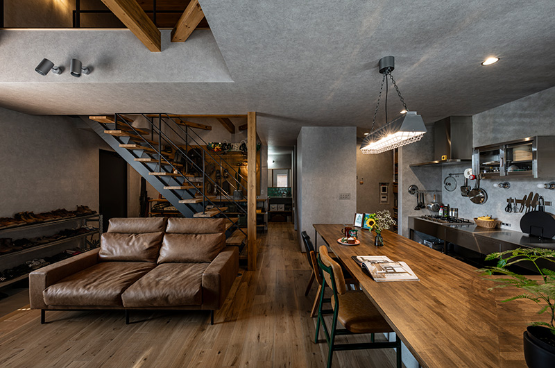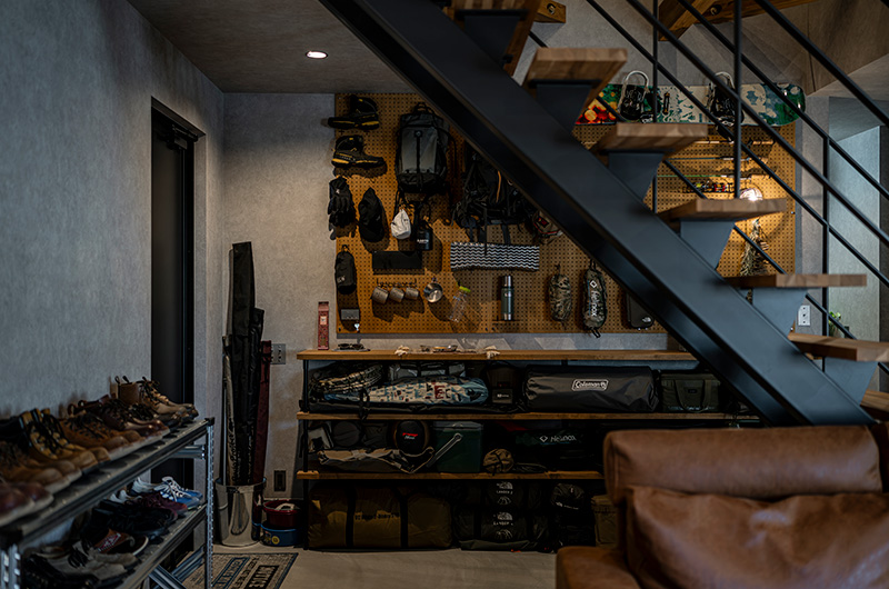 ご夫妻の希望は、鉄骨階段や有孔ボードを取り入れた「倉庫っぽい雰囲気の家」。
