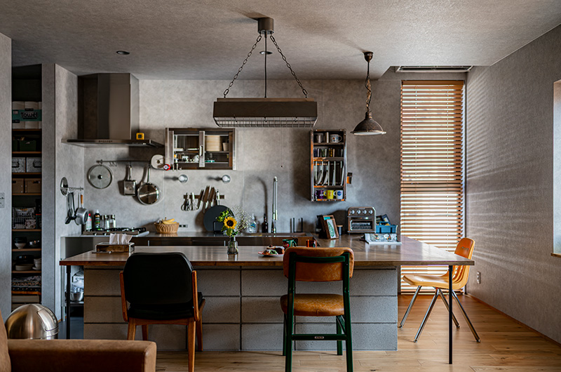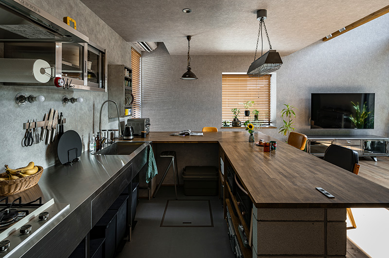 ▲キッチングッズは「見せる収納」で倉庫感を演出。カウンター下のコンクリートブロック風タイルがおしゃれ