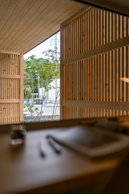 ▲作業中、ふと目を上げると格子越しの光と植栽が見える