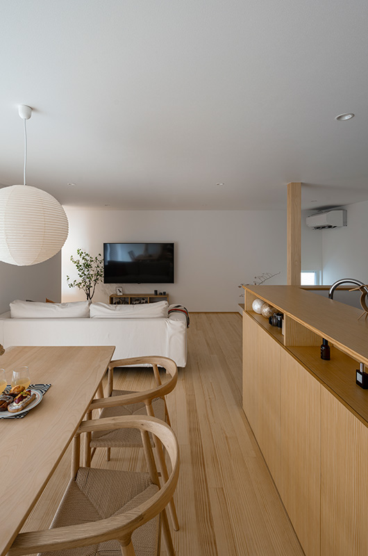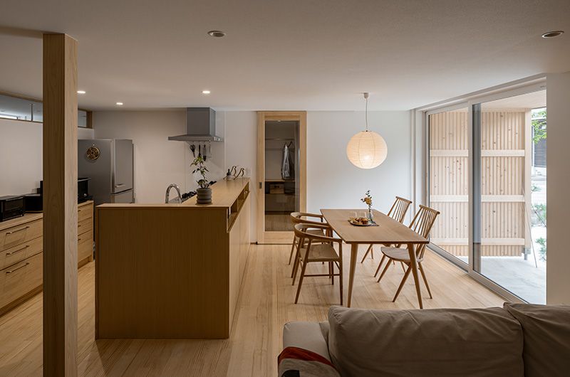 ▲和紙の照明が月明かりのような情緒あるダイニング
