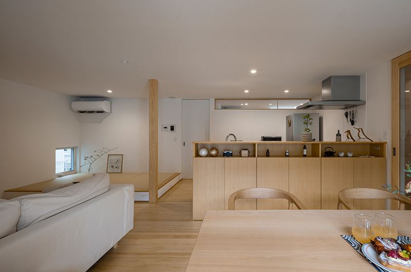 ▲キッチンの腰壁は一部をオープンにしてインテリアを愉しむ