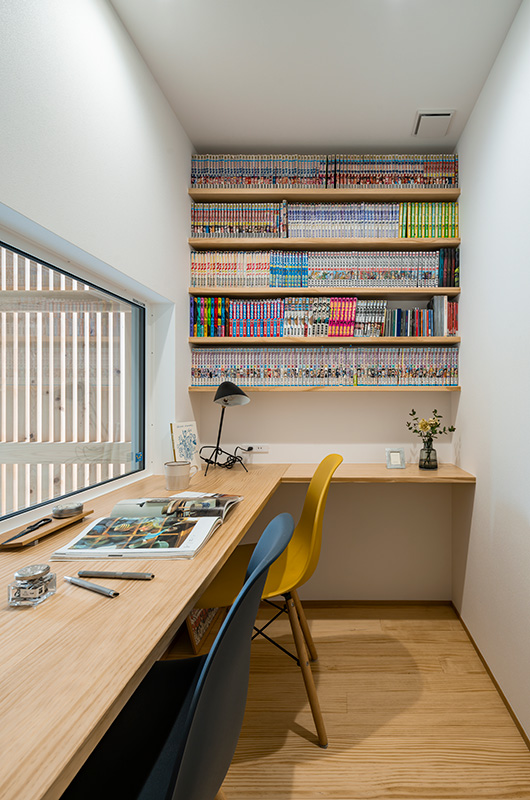▲書斎のL字カウンターは2人が並んで座れる余裕の広さ