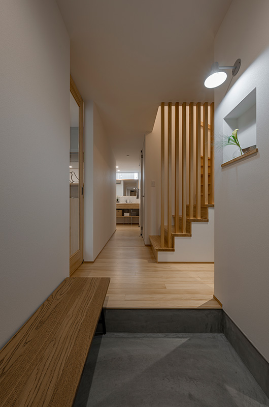 ▲玄関に造作したベンチは靴の脱ぎ履きがしやすい