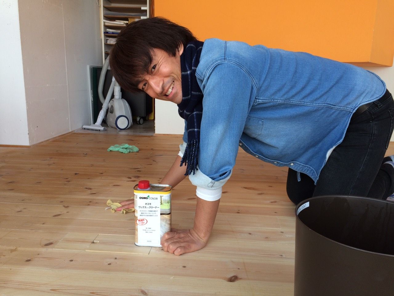 オスモの「ワックス&クリーナー」でワックスがけをする、設計士渡辺。